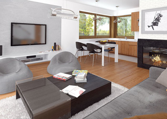 สองชั้นของการออกแบบที่ชาญฉลาด พื้นที่ของบ้านถูกจัดวางอย่างเชี่ยวชาญในสองระดับ: