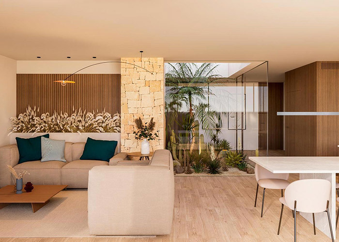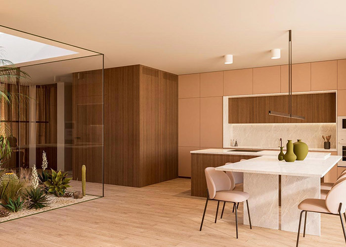 ทางเข้าผ่านพื้นที่นั่งเล่นขนาดใหญ่ ทางด้านซ้ายมีห้องนอนพร้อมห้องน้ำในตัว ให้ความสะดวกสบาย เหมาะสำหรับแขกหรือสมาชิกในครอบครัวที่ต้องการที่พักอาศัยชั้นเดียว ทางด้านขวา ห้องครัวและพื้นที่รับประทานอาหารถูกจัดวางเป็นพื้นที่ที่รวมเข้าด้วยกันสำหรับการใช้งานประจำวัน